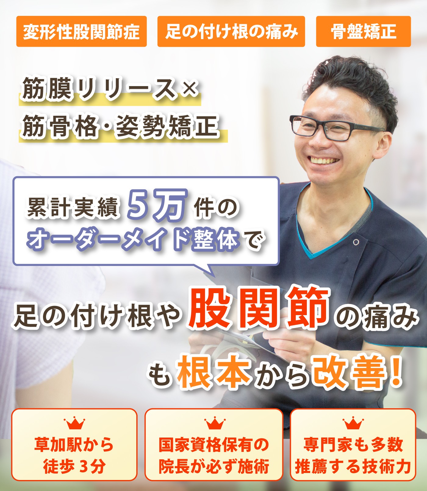 変形性股関節症、足の付け根の痛み、つまり感など股関節の痛み、骨盤の歪み矯正の施術経験が豊富な整体院です。施術して終わりではなく、その後の自宅でできるセルフストレッチや生活習慣の指導もいたします。